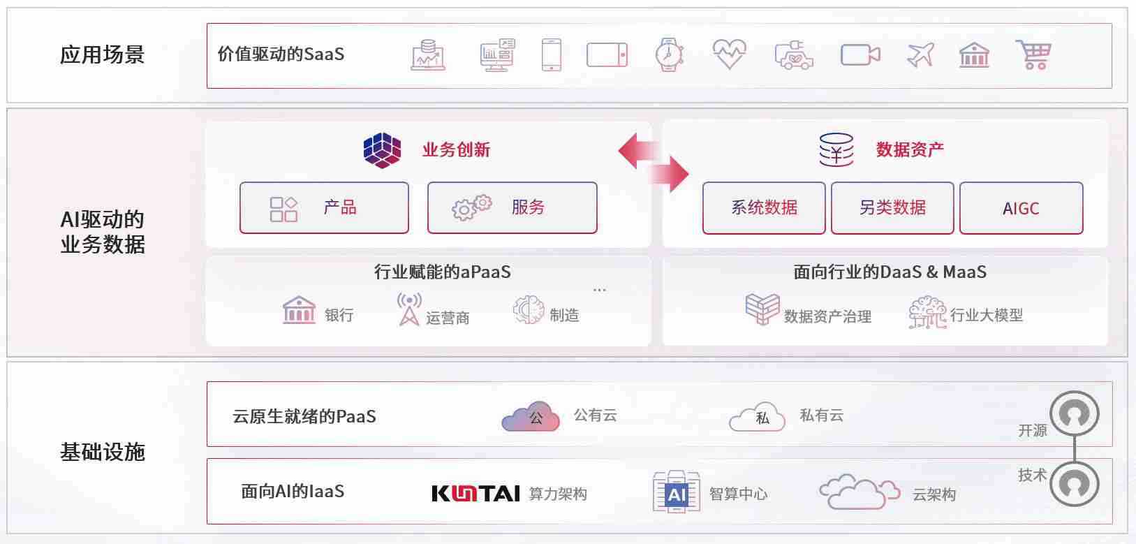 数字时代,,,,围绕企业数字化转型的关键要素,,,,z6尊龙旗舰厅数码开创性的提出数云融合战略和技术体系框架,,,,着力在云原生、、数字原生、、、AI原生和信创产业上架构产品和服务能力,,,,为处在不同数字化转型阶段的快消零售、、、、汽车、、、、金融、、、、医疗、、、、政企、、、教育、、、运营商等行业客户提供泛在的敏捷IT能力和融合的数据驱动能力,,构建跨界融合创新的数字业务场景和新业务模式,,,助力企业级客户建立面向未来的核心能力和竞争优势,,,,全面推动社会的数字化、、智能化转型升级。。